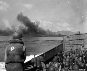 Vue de l’île de Leyte, P.I., ligne de rivage au point d’invasion. La fumée provient du bombardement naval. 20 octobre 1944.