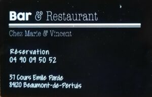 Bar Restaurant Chez Marie et Vincent Un endroit qui ne vous laissera pas indifférents, nous avons aimé… Accueil très chaleureux du personnel, très professionnel, agréable et souriant. Le « Bistrot » est un lieu simple et convivial où l’on se sent bien ; celui d’un petit café de campagne de notre belle Provence. Les plats sont faits maison, goûteux, copieux et très bien préparés. Très bon rapport qualité prix. Service au top ! Si vous passez à Beaumont-de-Pertuis, n’hésitez pas à y entrer ! vous ne le regretterez pas …