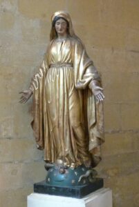 La Vierge en orante debout sur une coupole étoilée…et écrasant la tête du serpent. La pomme rappelle le Jardin d’Eden, la tentation et la chute. Église Saint-Jean de Malte, Aix en Provence. NAISSANCE ET FAMILLE Marie (en araméen « Maryam » ; en hébreu « Myriam » ; en grec « María » ou « Mariám » ; en arabe « Maryam »), ou Marie de Nazareth, est une femme juive de la province romaine de Judée, et la mère de Jésus de Nazareth (en Galilée). Elle naît au 1er siècle av J-.C, et meurt au cours du 1er siècle de notre ère au mont Sion (abbaye de la Dormition), ou à Éphèse (église de la Vierge Marie), selon des traditions locales. C’est une figure essentielle du Christianisme ; en particulier pour les Orthodoxes et les Catholiques, qui lui attribuent le titre de « Mère de Dieu », et la désignent par les dénominations « Sainte Marie », « Vierge Marie », « Sainte Vierge », « Notre-Dame », « Bonne Dame », « Bonne Mère » et « Sainte Mère ». La tradition mariale (relatif à la Vierge Marie) se fonde sur le Nouveau Testament (ensemble des écrits relatifs à la vie de Jésus et à l’enseignement de ses premiers disciples, écrits reconnus comme « canoniques » par les autorités chrétiennes au terme d’une évolution de plusieurs siècles.), et pour une part, sur la littérature apocryphe (écrit dont l’authenticité n’est pas établie), qui développe souvent des thèmes présents dans les textes canoniques du Nouveau Testament. Dans le Nouveau Testament, il est écrit que « Dieu a choisi pour être la mère de son fils une fille d’Israël ». Il s’agit de Marie, une jeune juive de Nazareth, en Galilée, « une vierge fiancée à un homme du nom de Joseph, de la maison de David ». La lecture de l’Ancien Testament suggère que Marie descend d’une longue lignée divine, que sa mission était dans le projet de Dieu, et qu’elle va l’accomplir. La tradition chrétienne a transmis le nom de ses parents : Anne et Joachim. Elle nous donne aussi le lieu de leur maison : à Jérusalem, près du temple. Les écrits apocryphes mentionnent ainsi sa naissance, son adolescence, sa vie à Éphèse, sa Dormition, et son Assomption. C’est une tradition très ancienne qui remonte au récit apocryphe de Jacques (datant du IIème siècle), intitulé le « Protévangile de Jacques ». Celui-ci rapporte que ce couple, frappé de stérilité, a pu, dans sa vieillesse, concevoir la Vierge Marie, Mère de notre Rédempteur Jésus. LA NATIVITÉ D’après l’évangile de Luc (chapitre 1, verset 26 à 38), Marie est fiancée à un charpentier du nom de Joseph. Il est prévu qu’encore vierge, elle donne naissance à un enfant d’origine divine. Choqué par la grossesse de sa fiancée, Joseph rompt discrètement avec Marie. Un ange lui apparaît alors et lui annonce la mission sacrée, la conception virginale, confiée à sa femme ; qu’il décide de ne plus répudier. Cet épisode, qui symbolise la Nativité, est commémoré chaque 25 décembre de l’année : c’est « Noël ». C’est à dos d’âne que le couple se rend à Bethléem, où Marie accouche dans une étable. Pour glorifier cet événement divin, les anges vont réunir des bergers qui viendront admirer la naissance virginale. La Nativité Selon Saint-Matthieu, trois mages originaires d’Orient ont également fait honneur de leur présence pour célébrer cet instant magique. LA DORMITION Le terme « dormition » (du latin : « dormitio », « sommeil, sommeil éternel, mort » en grec ancien : « kímisis ») est utilisé, dans le vocabulaire chrétien, pour désigner la mort non violente des Saints et des pieux fidèles. Le mot « cimetière » (issu du grec ancien : « kimitírion », « lieu pour dormir, dortoir ») exprime la même idée de sommeil temporaire. Ce terme s’applique plus particulièrement à la mort de Marie, Mère de Jésus. La dormition de Marie est souvent appelée simplement « dormition ». Les Églises d’Orient ont gardé cette dénomination antique sous la forme « la dormition de la Théotokos », du grec : « Théotokos » « Mère de Dieu », ou littéralement « Celle qui a porté Dieu » (qui se dit aussi « Théophore »). Elles entendent ainsi la mort de la Vierge Marie et la montée au ciel de son corps. Dans le catholicisme actuel, le terme « dormition » ne désigne que la mort de la Vierge ; la croyance de la montée au ciel de son corps porte le nom d’ « Assomption ». Les Églises d’Orient critiquent ce terme qui pourrait laisser croire que la Vierge a été enlevée au ciel de son vivant. L’ASSOMPTION L’Assomption de la Vierge Marie est une solennité liturgique de l’Église catholique ; elle est fêtée le 15 août, et commémore le terme de la vie terrestre de la Vierge Marie. Selon la théologie catholique, c’est avec son corps et son âme que Marie a été « assumée » ou « élevée au ciel », c’est-à-dire qu’elle est entrée directement dans la gloire de Dieu. SON CULTE Dans l’Église catholique, de nombreux miracles et « apparitions » ont été attribués à Marie au cours des siècles (en 2025, seulement 15 furent reconnus). Plusieurs sites d’apparitions mariales sont devenus des lieux de pèlerinages importants (Guadalupe, Lourdes, La Salette, Fatima…). D’aucuns ont prétendu des guérisons après avoir prié Marie. Pour moi, le Méridional natif de Marseille, il ne fait aucun doute que « Notre Dame de la garde » est incontournable ; elle représente l’amour de la mère dans le cœur de chaque Marseillais. Elle veille sur eux depuis toujours, et chacun a le sentiment d’être protégé par la « Bonne Mère ». Visible depuis les autoroutes, la gare Saint-Charles ou la rade de Marseille, Notre-Dame de la Garde centralise tous les regards. C’est le site le plus visité de Marseille. Symbole permanent de la ville, elle accueille chaque jour des centaines de personnes : hommes, femmes, enf