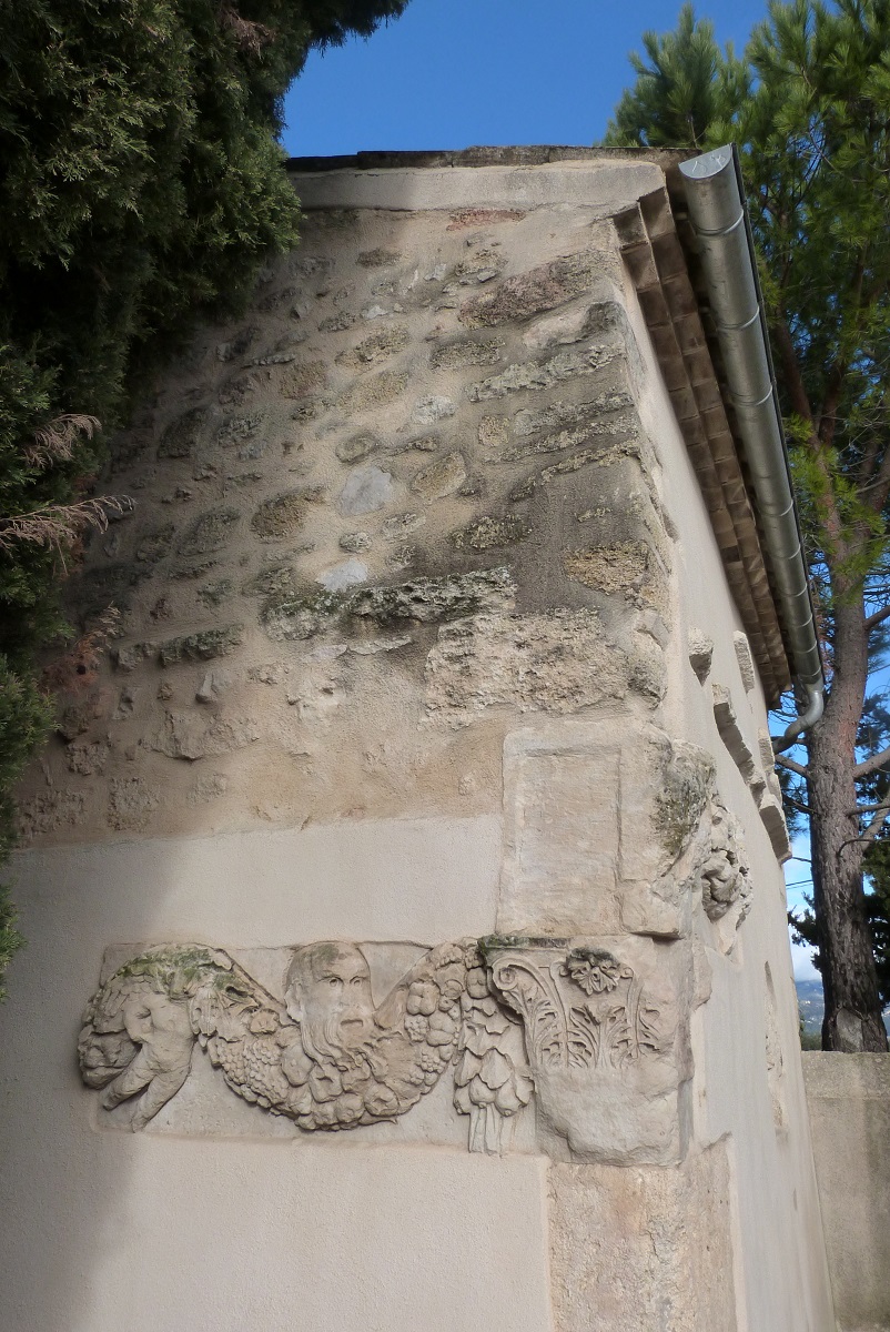 Vestiges d’un mausolée d’époque romaine (base moulurée, fragments de frise à guirlande, et masques de comédie). (2)