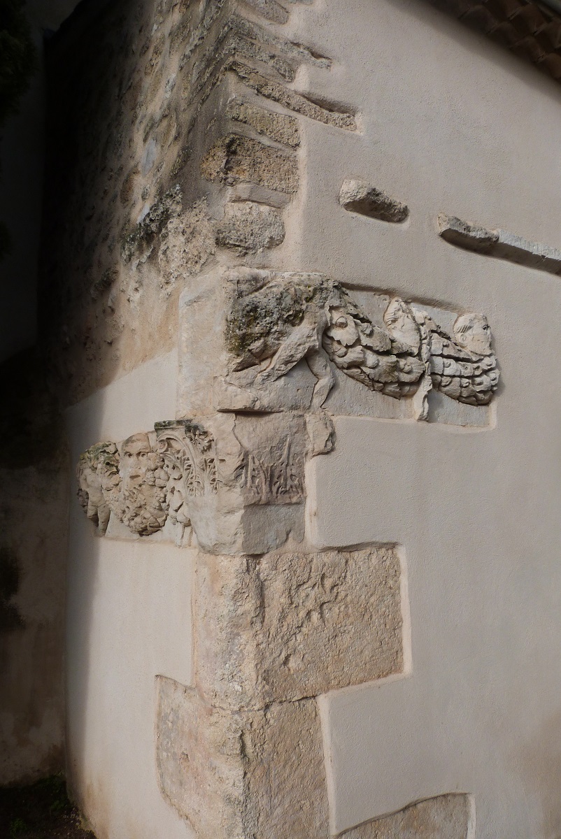 Vestiges d’un mausolée d’époque romaine (base moulurée, fragments de frise à guirlande, et masques de comédie). (4)