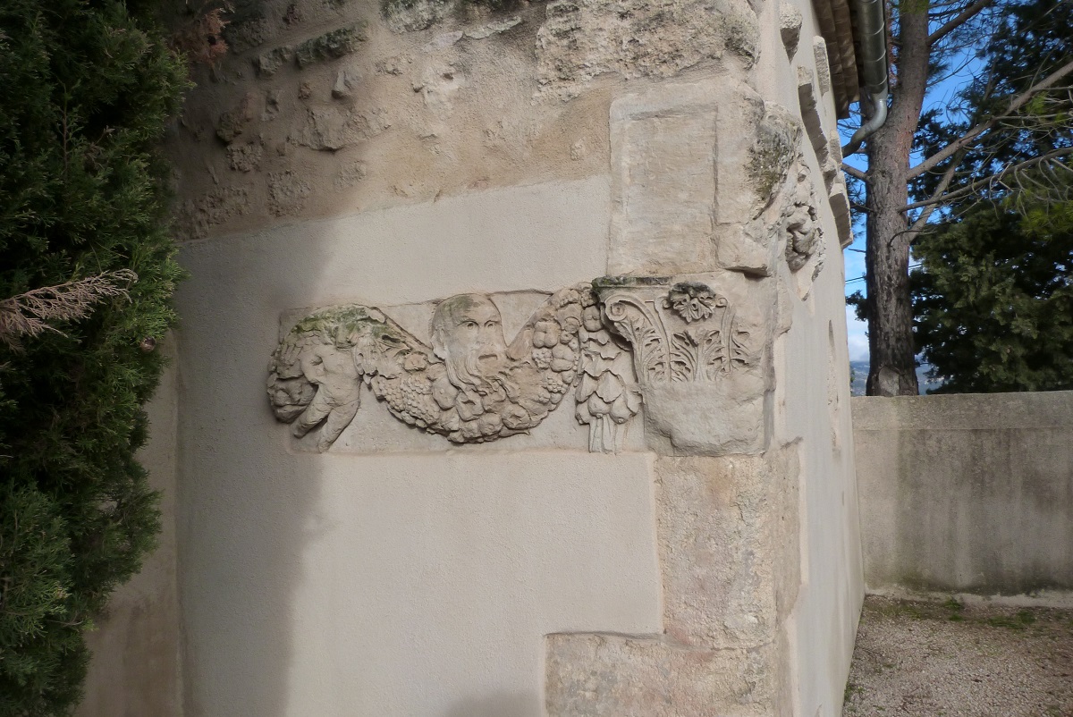 Vestiges d’un mausolée d’époque romaine (base moulurée, fragments de frise à guirlande, et masques de comédie).