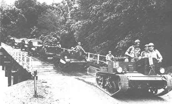 AIF Bren gun Universal carriers escortant des renforts dans les camions. Malaya, 2 janvier 1942.