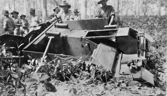 Des hommes du 2-19ème Bataillon se tenant autour d’un modèle local, le Bren Gun Carrier, s’enlisant dans un fossé en Malaisie. 1941
