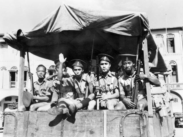 Des volotaires du Singapore Volunteer Corps faisant partie de la Straits Settlements Volunteer Force (SSVF) en route pour leur entraînement. Malaya, mars 1941.