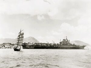 HMS Indomptable, vaisseau amiral du contre-amiral CHJ Harcourt, CBE, monte à l’ancre dans la baie Victoria, Hong Kong. Septembre 1945