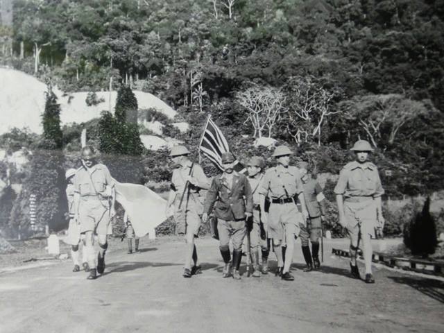 Le lieutenant-général Arthur Percival et son groupe portent l’Union Jack en route pour livrer Singapour aux Japonais. Singapour, 15 février 1942.