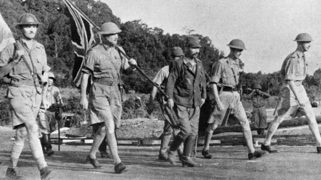 Le lieutenant-général Sir Arthur Percival, dirigé par un officier japonais, marche sous un drapeau blanc pour négocier la capitulation des forces alliées à Singapour, le 15 février 1942