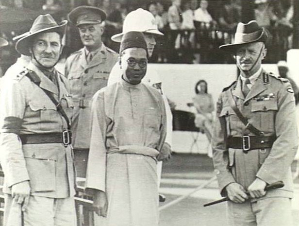 Le major-général australien H Gordon Bennett, avec le sultan de Selangor, lors de la journée de l’ANZAC. Singapour, 25 avril 1941