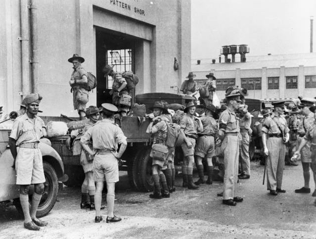 Les troupes australiennes déchargeant leur kit à leur arrivée à Singapour, avant d’être transportées vers leur camp en Malaisie. Singapour, février 1941.