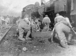Les troupes japonaises près des locomotives ferroviaires de Johore Bahru, en Malaisie, le 31 janvier 1942