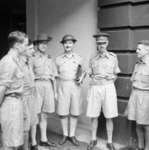 Lieutenant général Percival, GOC Malaya (deuxième à droite), avec des correspondants de guerre à Singapour, peu avant la capitulation, fin janvier 1942.