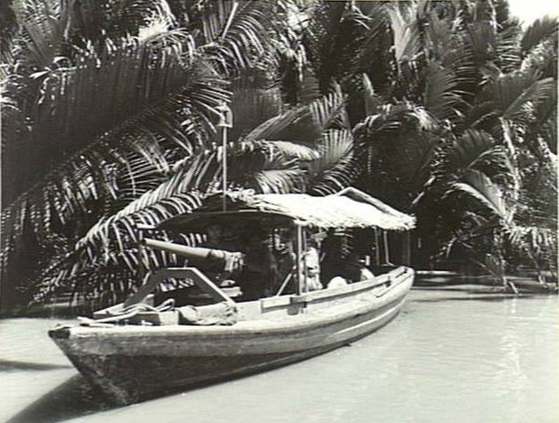 L’un des bateaux de patrouille fluviale qui contrôlent les rivières malaises. Septembre 1941