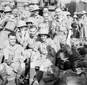 Troupes britanniques joyeuses à bord d’un transport de troupes arrivant à Singapour, octobre 1941