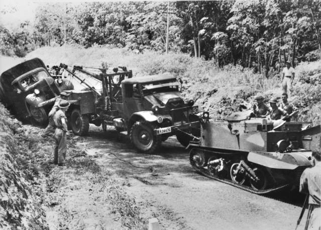 Un camion de l’armée indienne enlisé est aidé par un « Wrecker » australien et un transporteur britannique Universal, en tandem. Malaisie, janvier 1942