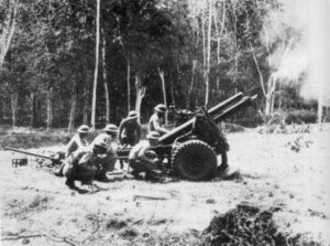 Un canon de 25 de la 8ème division d’artillerie Australine tirant à côté d’une plantation de caoutchouc à Johore, en Malaisie. Janvier 1942.