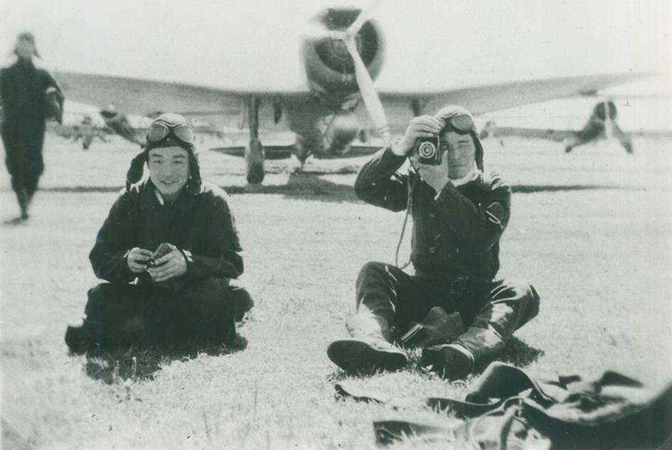 Une sorte de « selfie » vintage où un caméraman prend une photo d’un autre cameraman. Notez les bombardiers en plongée Aichi D1A à l’arrière-plan appartenant également au 12e Kokutai.