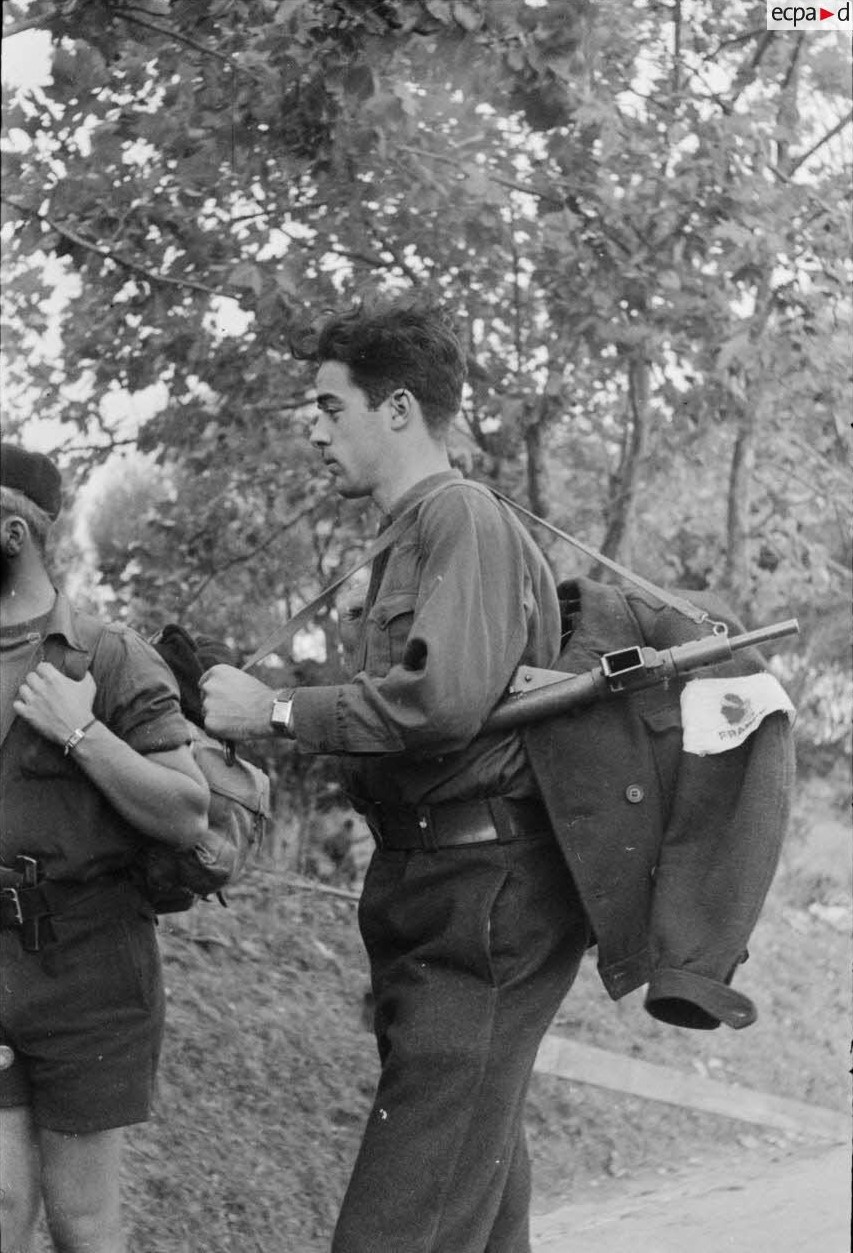 2 résistants dans la région de St Florent, dont l’un arbore un brassard artisanal à tête de maure surmontant l’inscription France