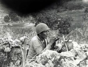Sur cette photo, prise en juin 1944, le soldat de 1ère classe Carl Nelson Gorman (soldat du Corps des Marines des États-Unis) guette, depuis son poste sur les hauteurs de Garapan, l’île de Saipan, dans l’archipel des Mariannes. Mais ce que cette image ne révèle pas instantanément, c’est que cet homme fait partie d’un groupe légendaire, celui des 29 premiers « Navajo Code Talkers » (ces Amérindiens qui ont bouleversé les communications militaires américaines dans le Pacifique). Recrutés en 1942 par les Marines, ces hommes mirent au point un code basé sur leur langue natale, le navajo ; une langue orale incroyablement complexe, et pratiquement inconnue des étrangers. Ce système de codage, d’une efficacité redoutable, ne fut jamais déchiffré par les forces japonaises. Grâce à ces hommes, les transmissions radio sur les champs de bataille (rapides, précises et indéchiffrables) ont joué un rôle décisif dans de nombreuses campagnes, dont Guadalcanal, Iwo Jima, Saipan et Peleliu. Carl Gorman, l’un des 29 premiers Code Talkers navajos – Saipan, juin 1944 Carl Gorman est né en 1907 en Arizona. Il fut bien plus qu’un soldat : avant la guerre, il était un artiste et un éducateur navajo, profondément attaché à ses racines et à sa culture. Son engagement dans l’armée représentait une affirmation de l’identité amérindienne au sein même de la machine militaire américaine. À Saipan, comme dans d’autres îles du Pacifique, Gorman transmit des messages codés vitaux sous le feu ennemi, garantissant la coordination des troupes et le succès des offensives. Après la guerre, il devint professeur d’art, et œuvra pour la reconnaissance des services rendus par les peuples autochtones aux États-Unis. Il faudra pourtant attendre plus de 40 ans pour que le rôle des « Code Talkers » soit pleinement reconnu. En 2001, le président George W. Bush leur rendit hommage, et Carl Gorman fut décoré à titre posthume. Son fils, R. C. Gorman, est devenu un peintre navajo de renommée mondiale. Carl Gorman est mort en 1998, mais son héritage (celui d’un homme qui mit sa langue au service de la liberté) continue d’exister.