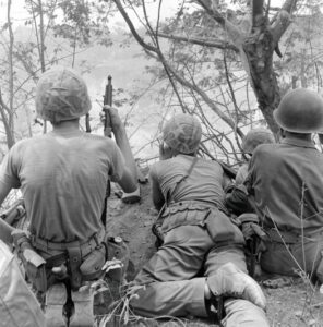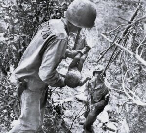 Dans les collines, les soldats utilisent des lance-flammes individuels, surtout dans les endroits que les lance-flammes motorisés ne peuvent atteindre. Ils développent progressivement des tactiques pour réduire efficacement les grottes, en utilisant une combinaison de lance-flammes et de charges de démolition, souvent pour en clôturer l’entrée.
