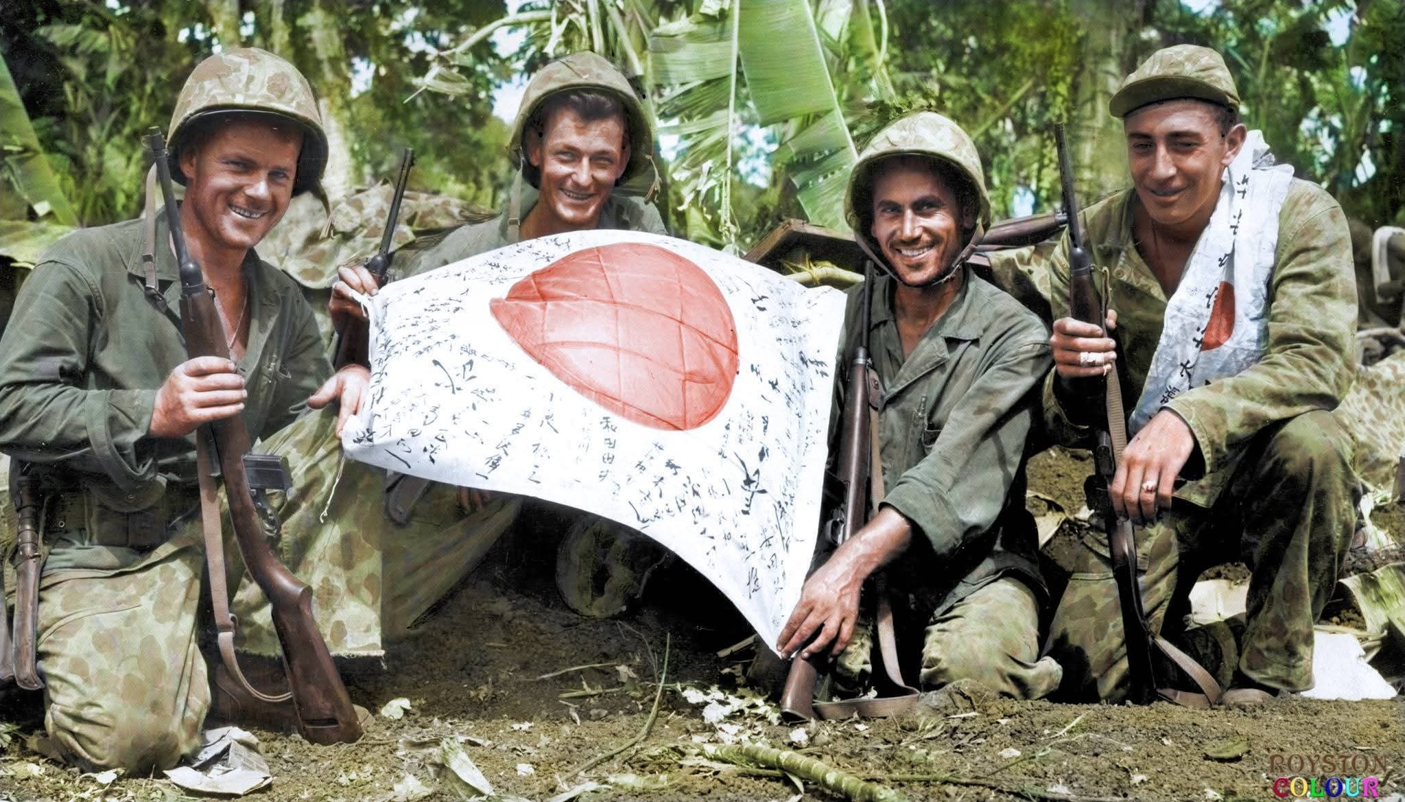 Des Marines arborant un drapeau japonais – Saipan juin 1944