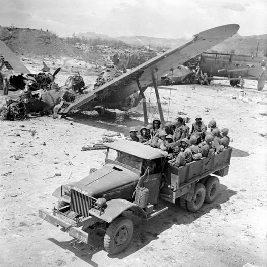 Les Marines roulent dans un camion international Harvester M-5H-6 de 2,5 tonnes à Saipan – juin 1944