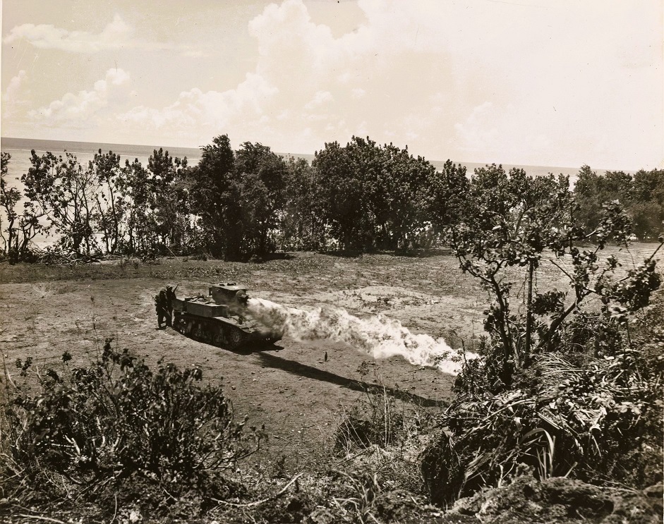 Pendant que les fusiliers restent dans la protection du char lance-flammes, un jet de feu est déchargé dans la position d’un sniper ennemi sur une colline Saipan.
