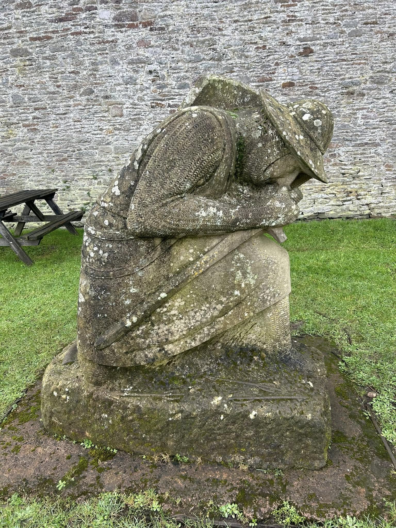 Sculpture de 5 tonnes de grès, un soldat du XIIIème siècle s’abrite d’une salve de flèches venant du mur au-dessus.