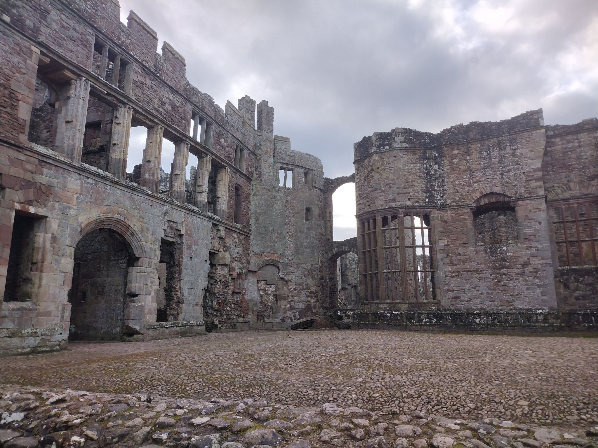 Le côté ouest de la cour en pierre inclinée, avec le hall et son oriel à gauche