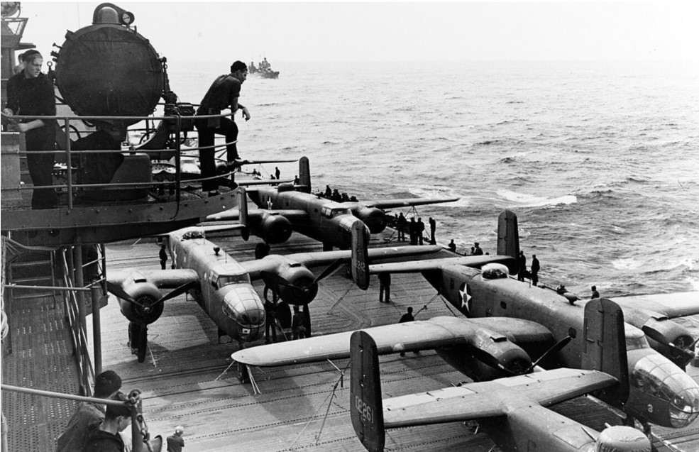 L’USS Hornet, en route vers Tokyo, avec les 16 bombardiers B-25 du raid Doolittle sécurisés sur son pont d’envol (6) – Copie2
