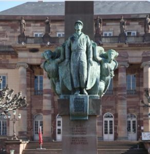 Obélisque en grès avec un bronze du général Leclerc entouré de personnages ailés angéliques sur la place Broglie, à Strasbourg