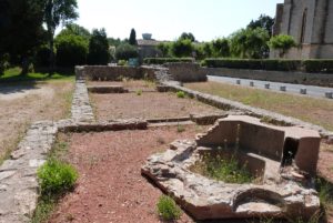 Au milieu des ruines, on distingue une cuve baptismale hexagonale et les pièces annexes d’un habitat.