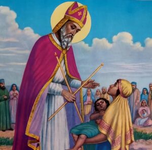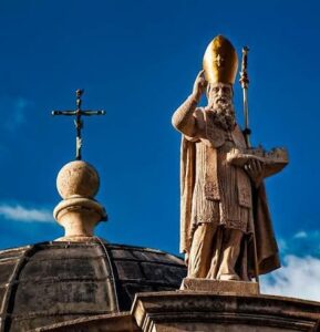 Saint Blaise de Sébaste BIOGRAPHIE C’était un évêque et un médecin originaire d’Arménie. Il naquit au IIIème siècle à Sébaste (ville de Turquie appartenant à la province de Sivas), y vécut et y mourut en 316, martyrisé sous Licinius sur ordre d’Agricola (gouverneur de Cappadoce). LA TRADITION Saint Blaise de Sébaste D’après la tradition, Saint Blaise intervenait dans les cas de maladies de gorge, surtout quand des arêtes s’y étaient enfoncées. La première attestation que nous avons de lui figure dans les écrits médicaux d’« Aetius Amidenus », qui invoqua d’ailleurs son aide dans le traitement des objets enfoncés dans la gorge. Au XIIème siècle, Jean Beleth indiquait que Blaise était invoqué aussi pour les maux de dents et pour les maladies des animaux. SA VIE Saint Blaise de Sébaste D’après les « Actes de saint Blaise » écrits en grec, Saint Blaise devint médecin à Sébaste (sa ville natale) après avoir étudié la philosophie dans sa jeunesse. Il soignait ses patients avec une grande ferveur et une profonde piété. La bonté de son cœur et la multitude de miracles accomplis ne faisaient aucun doute sur sa sainteté. L’on accourait de partout des environs pour faire soigner son âme et son corps ; les animaux sauvages eux-mêmes venaient en troupeaux pour recevoir sa bénédiction. Quand l’évêque de la ville mourut, la population acclama aussitôt Blaise pour qu’il lui succédât. SA MORT En 316, sur ordre de l’empereur Licinius, le préfet Agricola (gouverneur de Cappadoce et de la Petite Arménie) vint à Sébaste afin de mettre à mort tous les Chrétiens, et fit arrêter l’Évêque Blaise. Sur le chemin de la prison, une mère déposa à ses pieds son fils unique, qui était en train de mourir étouffé d’une arête qu’il avait avalée ; l’enfant fut instantanément guéri. Néanmoins, le gouverneur tenta de faire renoncer Blaise à sa foi ; mais en vain. Alors, ce dernier fut battu, attaché à un poteau, où l’on écorcha sa chair atrocement avec des peignes en fer (peignes à laine), puis décapité. Saint Blaise de Sébaste LA LÉGENDE DORÉE D’après La légende dorée (ouvrage rédigé en latin entre 1261 et 1266 par un Dominicain, Jacques de Voragine,) le récit du martyre de Saint Blaise est légèrement différent. Dans cette version, Blaise soigna également un enfant sur le chemin de la prison. Après sa nomination comme évêque, Blaise vécut en ermite dans une caverne, afin d’échapper aux persécutions de l’empereur Dioclétien. Il fut nourri par les animaux, qui, en retour, s’attroupaient autour de lui pour recevoir sa bénédiction et être soignés. Lors d’une partie de chasse, des soldats du gouverneur, voyant cette multitude de bêtes sauvages autour de Blaise, tentèrent d’en attraper, sans succès. Alors, le gouverneur fit arrêter Blaise. Saint Blaise de Sébaste par Hans Memling. Une fois emprisonné, Blaise refusa de faire des sacrifices aux dieux païens. Il fut torturé avec des peignes de fer, et le gouverneur ordonna qu’on le jette dans l’étang. Mais Blaise fît un signe de croix, et la surface de l’eau devint alors solide sous ses pieds. Fou de rage, le gouverneur ordonna qu’on le décapite. Au moment de sa mort, Blaise demanda à Dieu que quiconque l’invoquerait pour un mal de gorge (ou tout autre maladie) soit exaucé ; le Seigneur lui accorda sa prière. Statue de saint Blaise à Dubrovnik. SON CULTE Le 3 février, l’Église fête Saint Blaise de Sébaste, le Saint évêque médecin. Il est particulièrement prié pour les maux de gorge et pour la santé des troupeaux (il soignait les animaux, même les plus féroces). Son courage face à la mort et sa dévotion totale aux autres font de lui un exemple de sainteté. Blaise de Sébaste Dans l’iconographie, on montre souvent Saint Blaise avec les instruments de son martyre, les peignes en fer. La ressemblance de ces instruments de torture avec les peignes de laine qui causèrent son supplice, fit adopter le Saint comme patron des cardeurs de laine en particulier, et du commerce de la laine en général. Il peut aussi être représenté avec des bougies, car elles lui furent apportées lorsqu’il était en prison. SAINT BLAISE, LE SAINT AUXILIAIRE… Les Saints auxiliateurs. Les saints auxiliateurs (ou auxiliaires) sont un groupe de 14 Saints considérés comme particulièrement secourables, soit que leur intermédiaire auprès du Seigneur ait plus d’efficacité, soit qu’ils passent pour plus abordables aux prières, en particulier dans les situations d’urgence. Tous les saints auxiliaires, sauf Saint Gilles, sont des martyrs.