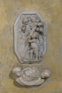 Bas-relief – L’Enfant Jésus tenant la croix et deux angelots portant un calice et une couronne d’épines