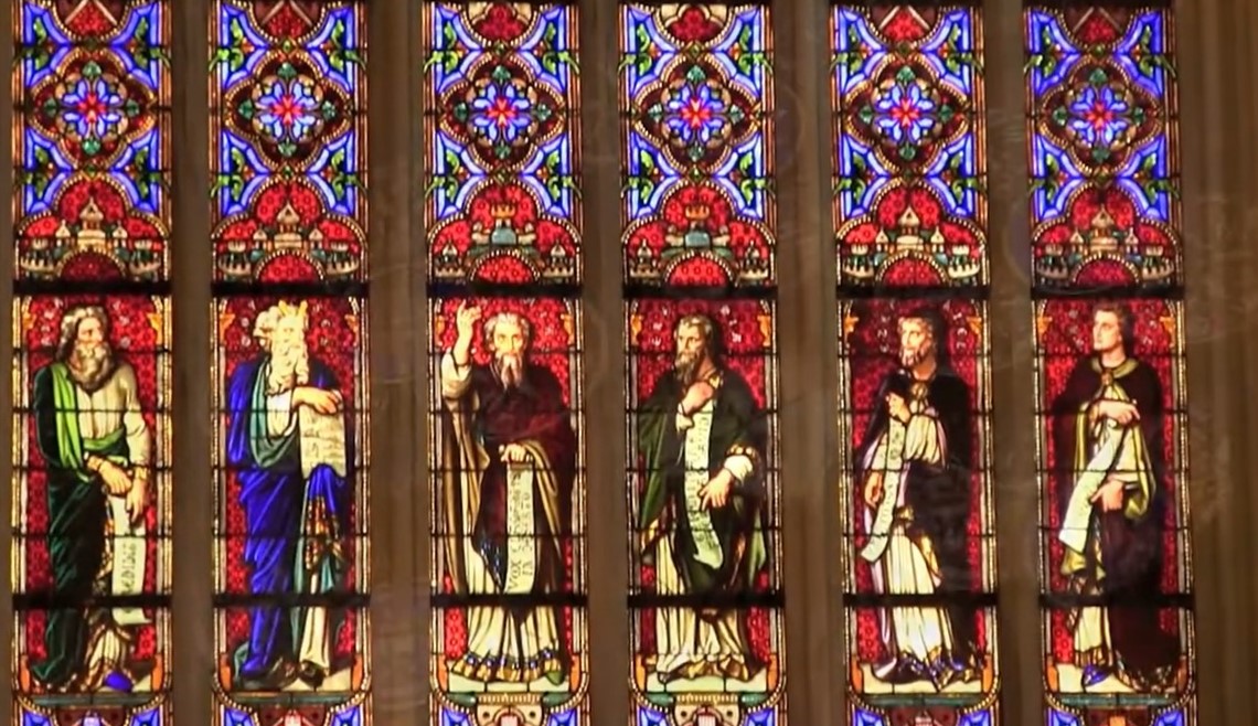Détails de la grande verrière du choeur – Abraham, Moïse et les quatre grands prophètes Isaïe, Jérémie, Ézéchiel et Daniel.