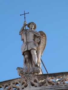 L’archange saint Michel terrassant Satan représenté par un dragon. Entrée principale de l’université de Bonn. Michel (ou Michael, ou encore Michaël) est un ange majeur (avec Gabriel et Raphaël notamment) dans les trois religions monothéistes que sont le Judaïsme, le Christianisme (dont le Catholicisme et l’Orthodoxie), et l’Islam. L’ARCHANGE SAINT-MICHEL L’archange Saint-Michel Il est celui qui conduit les morts et pèse les âmes le jour du jugement dernier. Il combat le dragon (ou le diable). Il est juge et guide du salut des âmes pour l’Enfer ou le Paradis (allégorie symbolique de la victoire finale du Bien sur le Mal). C’est un Saint dit « Céleste ». C’est pour cette raison qu’il est le plus souvent installé au bout d’une flèche ou en hauteur (comme sur le Mont Saint-Michel, ou la cathédrale Saint Sauveur d’Aix en Provence). L’archange Saint-Michel terrassant le dragon. Flèche de l’Abbaye du Mont-Saint-Michel Ce vocable est très utilisé vers l’an Mil, puis au XIVème siècle, quand Saint Michel devient un symbole du combat contre « l’église réformée protestante ». Saint Patron des chevaliers, il est le plus souvent représenté en habit de soldat ou de chevalier ailé « sauroctone » (tueur de dragon), arborant une épée ou une lance et tenant parfois un bouclier décoré d’une croix. L’archange Saint-Michel- cathédrale Saint-Sauveur Aix en Provence Il est le Saint patron de la Normandie et de la France (ordre de Saint-Michel, avec également la Sainte Vierge dans son Assomption à partir de 1638, selon le vœu de Louis XIII). Il est aussi le Saint patron de l’Allemagne (avec Saint Boniface de Mayence), de la Belgique (avec Saint Joseph), ainsi que de Bruxelles (il se retrouve d’ailleurs sur son blason). Blason de la ville de Bruxelles Depuis avril 2017, il est aussi le Saint patron de la Cité du Vatican (avec Saint-Joseph), selon la consécration du Pape François et selon le vœu du pape émérite Benoît XVI. Saint-Michel est désigné comme Saint par l’Église orthodoxe et l’Église catholique, et figure donc au calendrier ; il est célébré chaque année le 29 septembre.