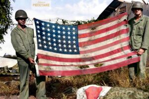 Dans cet enfer tropical, les « corpsmen » (infirmiers) jouent un rôle vital. Non-combattants armés d’un brassard rouge, d’un courage immense, ils s’élancent sous les balles pour secourir les blessés, souvent au péril de leur vie. Le geste capturé ici n’est pas anodin : il est l’expression ultime de la fraternité des armes, où chaque goutte d’eau partagée devient un acte de survie, de dignité et d’espérance. Mais au-delà du bilan militaire, cette photo rappelle que dans chaque guerre, il existe aussi des actes de tendresse, de dévouement et de lumière. Des moments où la barbarie recule face à l’humanité. Le « corpsman » qui tend l’eau à son frère d’armes ne soigne pas seulement une blessure, il sauve ce qu’il reste de civilisé dans un monde en flammes.