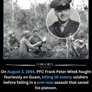 Le 3 août 1944, lors de la bataille de Guam, le soldat de première classe Frank Peter Witek, âgé de 22 ans, entre dans l’histoire. Avançant avec le 9ème Marines, son peloton est pris dans une embuscade. Sous le terrible feu japonais, Witek résiste sur le terrain, tirant sans cesse à bout portant pour protéger ses compagnons. Même quand d’autres reculent, il refuse de laisser un camarade blessé, couvrant l’évacuation avant de continuer seul. Avec des grenades et son fusil, il détruit un nid de mitrailleuses, tuant huit soldats ennemis. Lorsque quelques instants plus tard, Witek sera abattu, il ne lui reste plus que 8 balles sur les 240 que comportait son arme. Pour son courage et son sacrifice extraordinaires, il recevra à titre posthume la médaille d’honneur. Son nom figure parmi les marines qui ont tout donné pour la victoire dans le Pacifique. Source : citations de la médaille d’honneur du Corps des Marines américains, records de la Seconde Guerre mondiale