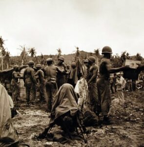 Les Marines débarquent sous le feu nourri des défenseurs japonais, solidement retranchés dans les grottes, les collines boisées et les bunkers de fortune.