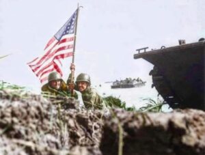Le 21 juillet 1944, à peine 8 minutes après que les Marines du « 3rd Marine Division » ont posé le pied sur les plages de l’île de Guam, dans le Pacifique, deux soldats américains gravent un moment d’histoire dans le sable brûlant de l’île : ils plantent la première bannière étoilée sur le sol reconquis.