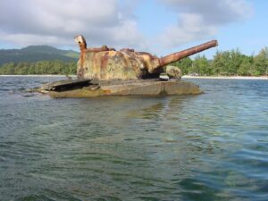 Epave d’un tank amphibie allié qui a coulé dans les eaux près de l’île de Guam. Ce char est l’une des nombreuses reliques de la Seconde Guerre mondiale trouvées sur les fonds marins autour de l’île