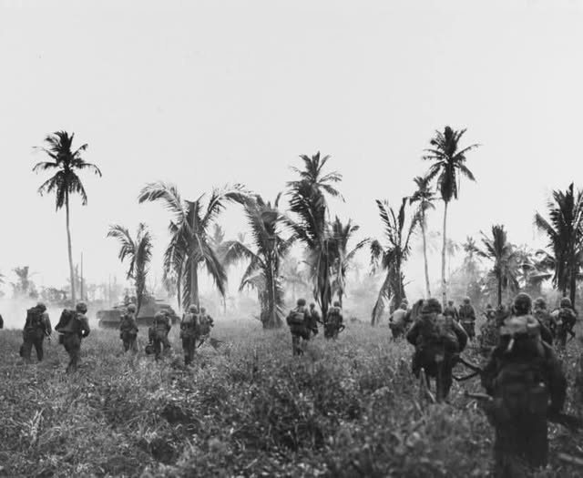 Les Marines américains, soutenus par les chars Sherman, avancent à travers la jungle sur l’île de Guam en 1944.