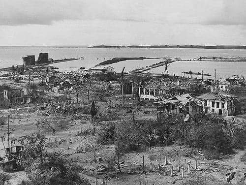 Sumay en ruines sur l’île de Guam dans les Mariannes quand les marines l’ont récupérée. Les ruines indiquent les combats acharnés qui ont eu lieu. En arrière-plan, c’est l’île de Cabras. 1944.