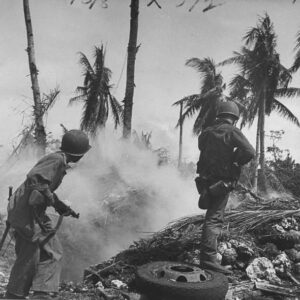 Un artilleur de barres marines inspecte un trou de renard japonais pendant la bataille de Guam en 1944. 1