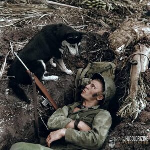 Un marine américain assis dans un trou de renard regardant un chien de reconnaissance lors de la deuxième bataille de Guam en août 1944.