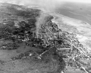 Vue aérienne d’Agana, Guam. Photo prise en avion depuis l’USS Yorktown. 5 septembre 1944.