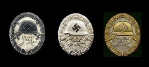 Version de l’insigne de blessure en noir, argent et or, du 20 juillet 1944 Par la suite, Hitler a ordonné qu’un insigne de blessure spécial soit décerné commémorant l’événement, car il croyait que « le destin était intervenu » pour lui.