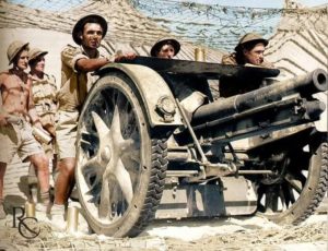 Le 27 août 1941, dans le secteur d’El-Adem, au sud de Tobrouk, des soldats de la compagnie D du 2/17ème bataillon d’infanterie de la 9ème division australienne utilisent un canon de campagne italien capturé. Cette scène illustre parfaitement l’un des aspects marquants de la campagne d’Afrique du Nord : l’utilisation par les Alliés du matériel saisi à l’ennemi, dans un théâtre d’opérations où chaque pièce d’artillerie comptait. Australiens avec de l’artillerie capturée La 9ème division australienne à Tobrouk La 9ème division australienne fut l’une des unités les plus héroïques de la défense de Tobrouk, assiégée par les forces germano-italiennes de mars à décembre 1941. Les « Rats de Tobrouk », comme les surnomma ironiquement la propagande allemande, tinrent leur position pendant plus de huit mois, repoussant assauts blindés, bombardements aériens et attaques d’infanterie. Le 2/17ème bataillon, formé en Nouvelle-Galles du Sud, faisait partie de la brigade engagée sur plusieurs points stratégiques du périmètre défensif. Ces hommes participèrent à des patrouilles offensives, à des embuscades nocturnes et à la récupération de matériel ennemi. L’artillerie italienne capturée Les troupes australiennes, souvent en infériorité numérique et matérielle, eurent recours à une pratique répandue : retourner contre l’ennemi ses propres armes. Le canon visible sur la photo est un pièce d’artillerie italienne saisie au cours des combats. Ces armes capturées permettaient de renforcer les défenses alliées et d’économiser des munitions, tout en symbolisant la supériorité tactique des défenseurs. El-Adem, un secteur stratégique Le secteur d’El-Adem constituait un point crucial pour le contrôle de l’accès à Tobrouk. Situé sur la route menant à la base fortifiée, il fut le théâtre de nombreux affrontements entre les forces de l’Axe et les défenseurs australiens. L’image de ces soldats australiens illustre à la fois l’âpreté des combats en Afrique du Nord et l’ingéniosité des troupes alliées. Elle rappelle aussi le rôle décisif des unités australiennes dans une bataille qui devint l’un des symboles de la résistance alliée face à Rommel.