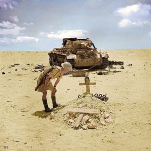 Un moment de silence face à la tombe improvisée d’un équipage ennemi… Recueillement – Face à la tombe improvisée d’un équipage ennemi. 29 septembre 1942. La guerre, dans sa cruauté nue, se fige un instant dans un champ tourmenté d’Afrique du Nord. Un soldat britannique s’arrête, solitaire, devant une tombe creusée d’une manière sommaire. Ce qu’il observe n’est ni un monument glorieux, ni une sépulture régimentaire alignée au cordeau. C’est une croix de fortune, dressée à la hâte, marquant la fin de cinq vies allemandes. Cinq hommes tombés dans un « Panzerkampfwagen III Ausf. J » touché de plein fouet dans les combats récents. Derrière le soldat britannique, le char gît, disloqué, calciné. Un Panzer de la variante J, reconnaissable à son canon court de 50 mm KwK L/42 (redoutable au début du conflit, mais ensuite à peine suffisant face aux blindés alliés plus récents). L’engin n’est plus qu’une carcasse noire, éventrée, témoin de la violence des combats et de l’issue implacable d’un tir direct et précis. La photo, prise par le sergent Silverside, ne montre aucun triomphalisme. Seulement un homme en uniforme, figé dans un moment d’humanité silencieuse. Il regarde. Peut-être pense-t-il à ses propres camarades tombés. Peut-être se dit-il que l’un ou l’autre aurait pu finir là, de l’autre côté du viseur. Ou peut-être ne pense-t-il rien du tout, tant l’évidence de la mort impose le respect, même quand elle frappe l’ennemi. C’est dans ce genre d’images que la guerre révèle un visage plus bienveillant que celui des victoires ou des défaites. Celui d’une humanité partagée dans le chaos. Celui d’un homme qui s’arrête. Parce que devant une tombe fraîche, on ne passe pas sans regarder.