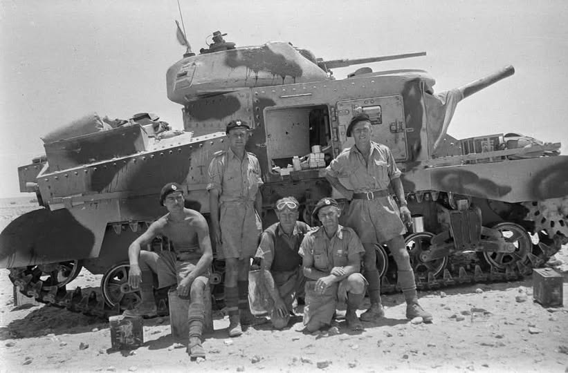 Un groupe de tankistes britanniques pose devant un char moyen M3 Grant